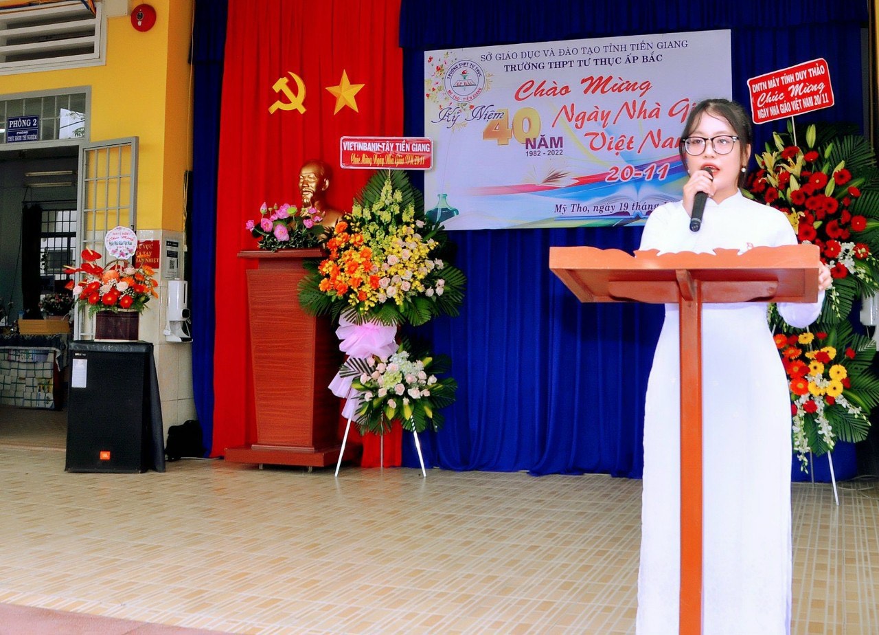 Gia Ngân đọc phát biểu trong ngày lễ Nhà giáo Việt Nam.