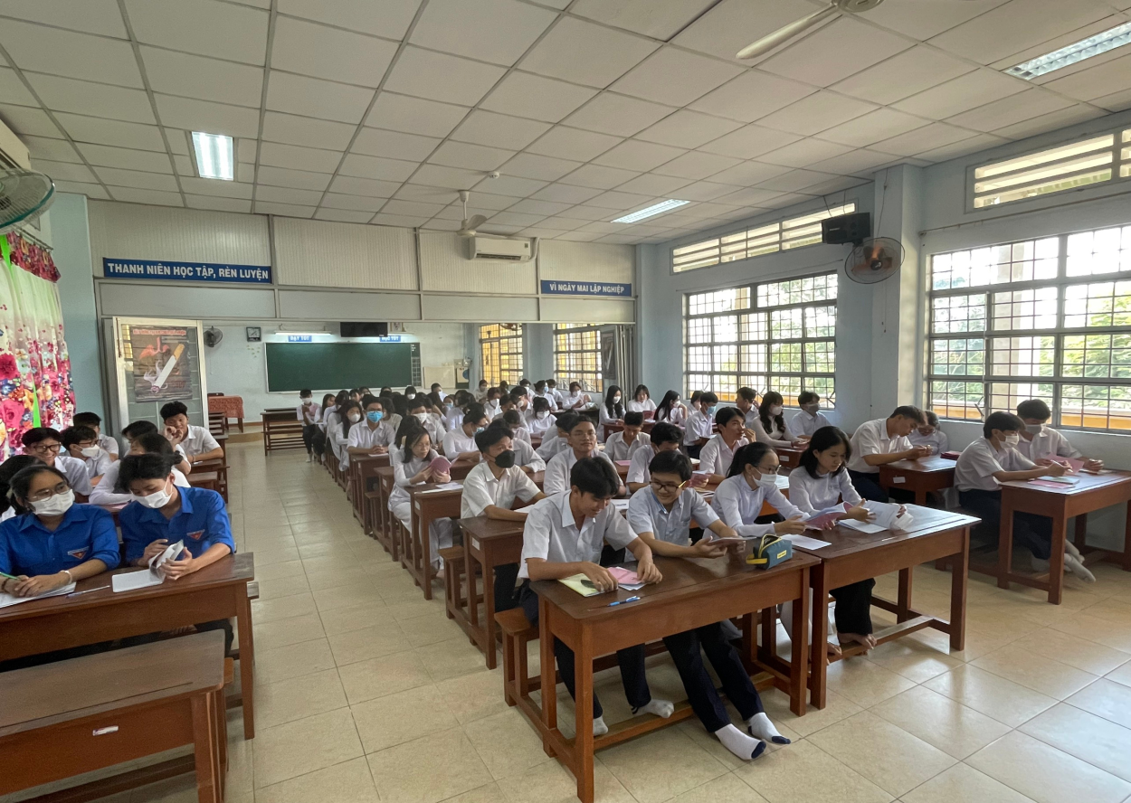 Trúc Ly (Áo thanh niên Việt Nam ngồi phía bên trái) trong một hoạt động của Đoàn trường