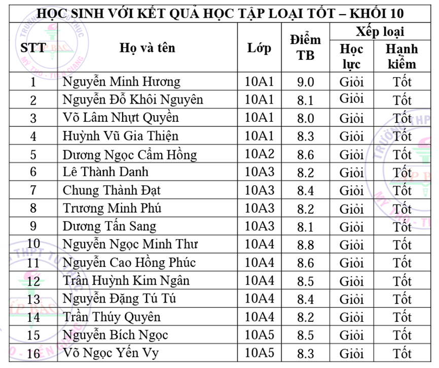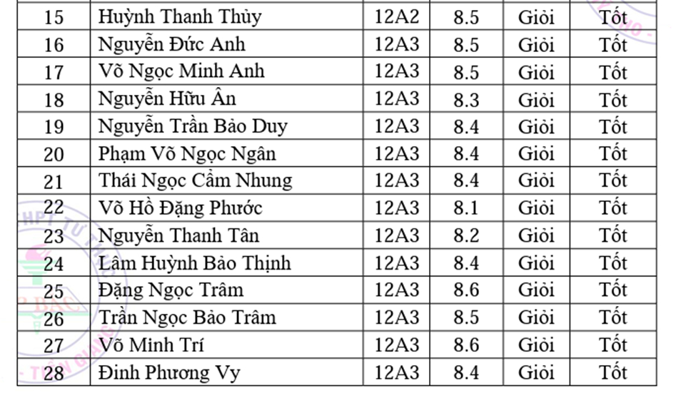 Dưới đây là danh sách các em học sinh với những thứ hạng cao trong năm học 2022-2023: